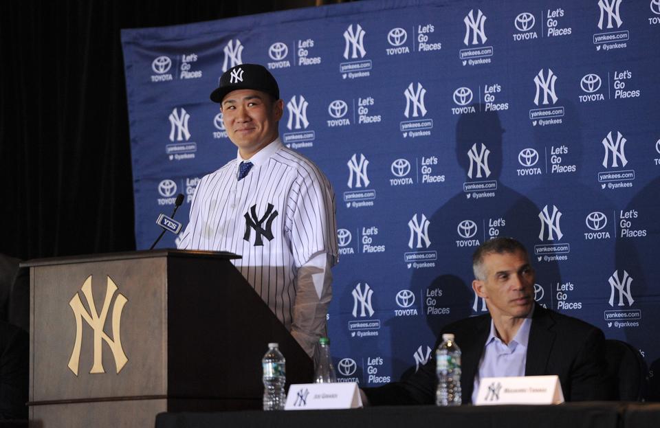 Tanaka se colocó su camiseta con el número 19 y dijo, en inglés, «estoy muy contento por ser un yanqui».