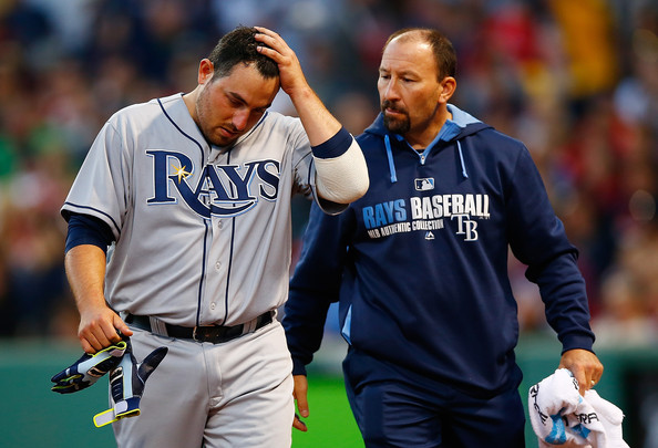 El mexicano Alí Solís, en su primer juego como titular en la receptoría de los Rays. Fue alcanzado por un lanzamiento picado mientras tomaba turno en el segundo inning. la pelota se estrelló en e receptor AJ Pierzynsky y le rebotó en el rostro en el que era su primer turno de la campaña