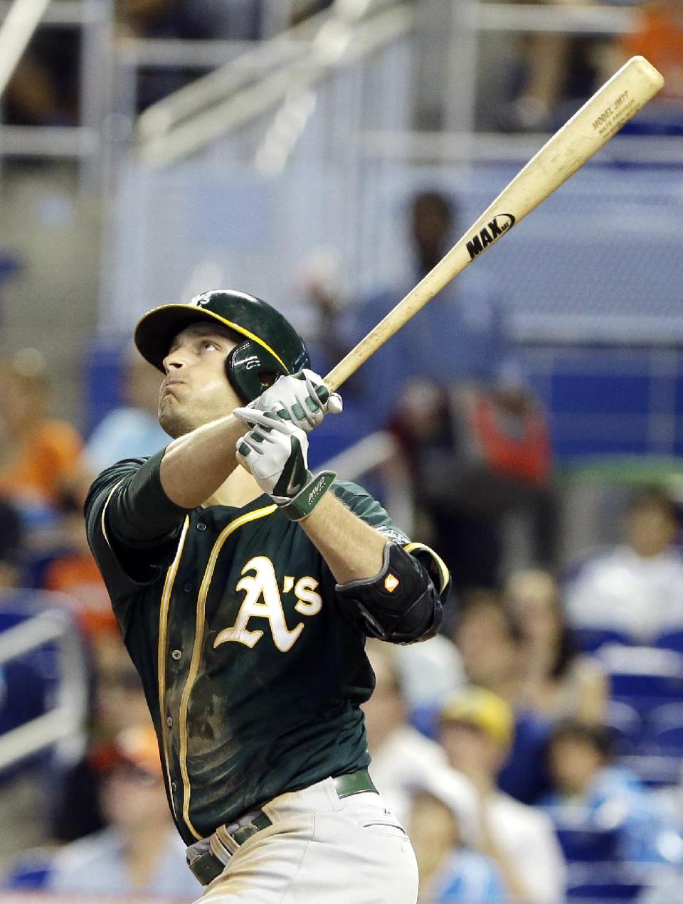 Nate Freiman bateó un cuadrangular de tres carreras en su debut de 2014 y los Atléticos de Oakland derrotaron el domingo 4-3 a los Marlins de Miami, barriéndolos en la serie de tres partidos.