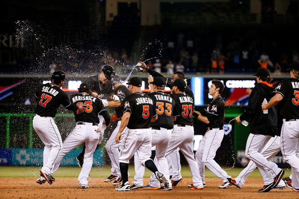 Casey McGehee abrió el noveno con un boleto expedido con cuatro pitcheos malos, Garrett Jones dio doble y Marcell Ozuna produjo una carrera con un sencillo. Un elevado de sacrificio de Jarrod Saltalamacchia puso la pizarra 6-5, y un lanzamiento descontrolado permitió que Ozuna avanzara a la intermedia.
