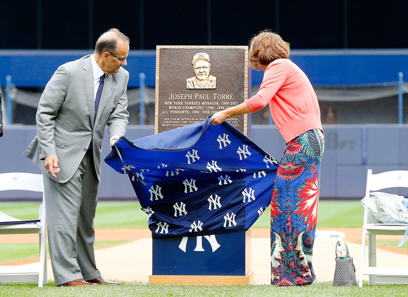 Torre se montó en un carrito de golf con Yogi Berra para llegar frente al montículo, donde los Yanquis le presentaron la 29na placa que estará en la zona detrás del jardín central del estadio. El equipo también regaló a Torre un anillo.