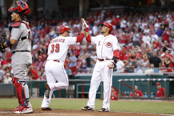 Devin Mesoraco disparó un vuelacerca y produjo tres carreras, para que los Rojos de Cincinnati doblegaran el martes 9-5 a los Cardenales y cortaran una racha de seis derrotas consecutivas contra San Luis.