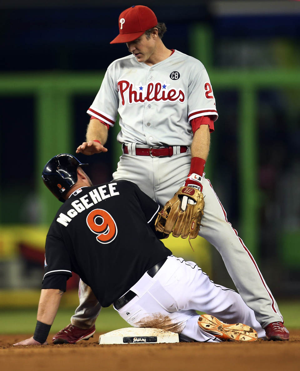 Casey McGehee remolcó tres carreras, incluyendo dos con un doblete que rompió el empate en el séptimo episodio, y los Marlins de Miami remontaron en el último juego en casa de la temporada para vencer el jueves 6-4 a los Filis de Filadelfia.