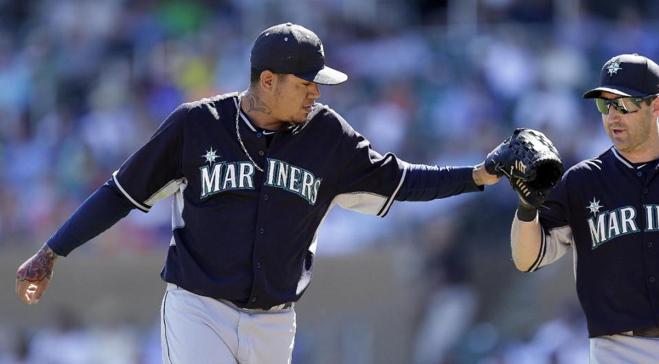 La primera apertura de Félix Hernández en la pretemporada comenzó con un elevado que viajó 400 pies y un boleto antes que el as de Seattle se asentó para cubrir el martes dos innings sin permitir carreras en la derrota 9-3 de los Marineros