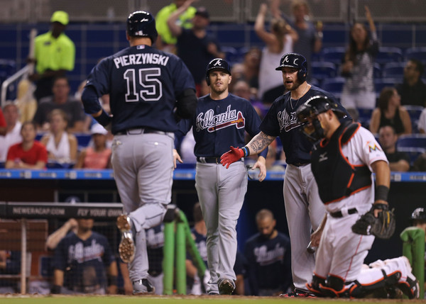 A.J. Pierzynski sacudió un jonrón de dos carreras y cinco lanzadores se combinaron para tirar pelota de seis hits para que ls Bravos de Atlanta completasen una barrida de tres juegos al vencer el miércoles 2-0 a los Marlins de Miami.