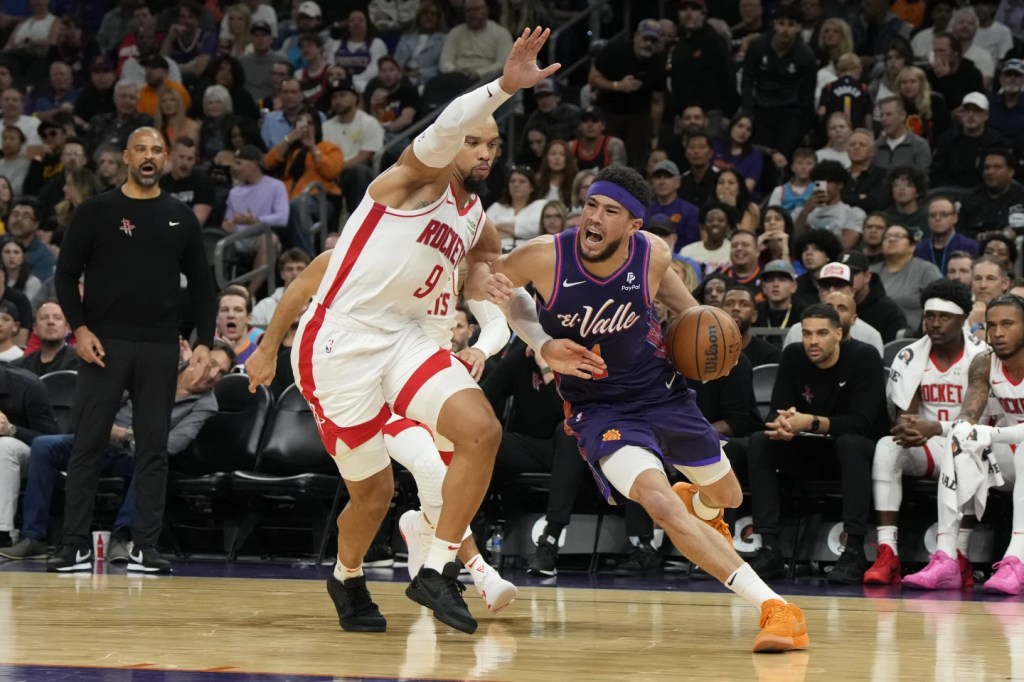Devin Booker anotó 35 puntos, Kevin Durant agregó 24 y los Soles de Phoenix vencieron el jueves 110-105 a los Rockets de Houston para abrir una serie de dos juegos.