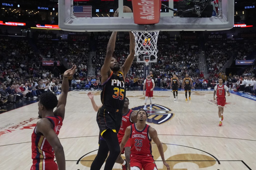 Kevin Durant aportó 20 puntos y Jusuf Nurkic añadió 19 por los Suns, que llegaron a tener ventaja de hasta 25 en el tercer periodo. Nueva Orleáns acortó el déficit con una racha de 20-8 para abrir el último cuarto 103-90.
