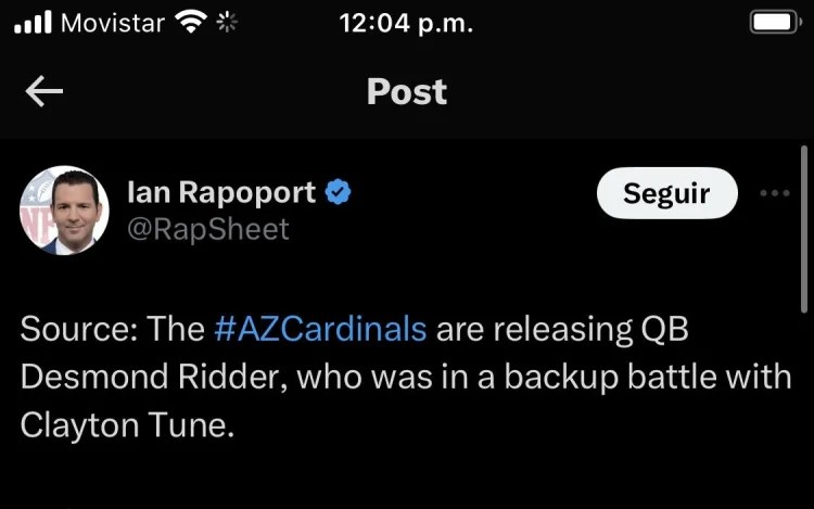 Los Cardenales de Arizona están cortando al mariscal de campo veterano Desmond Ridder mientras el equipo comienza a recortar la plantilla de 53 hombres, según Ian Rapoport de NFL Network.