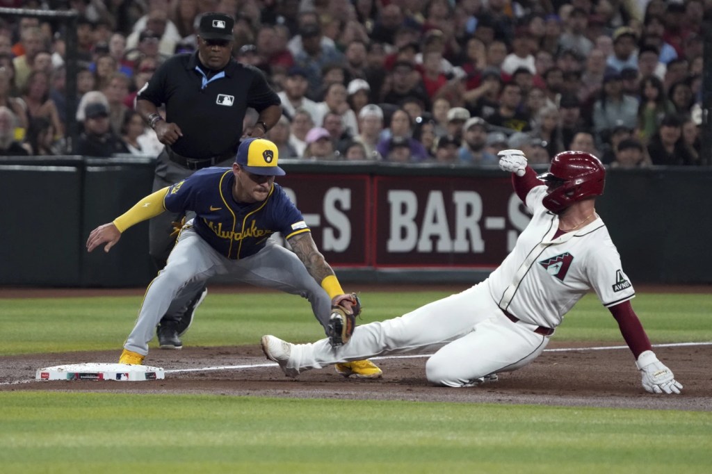Jackson Chourio fue interceptado en primera por Rodríguez en la tercera entrada y un tiro detrás de Garrett Mitchell del receptor de Arizona José Herrera llevó a un out forzado en tercera después de una carrera.