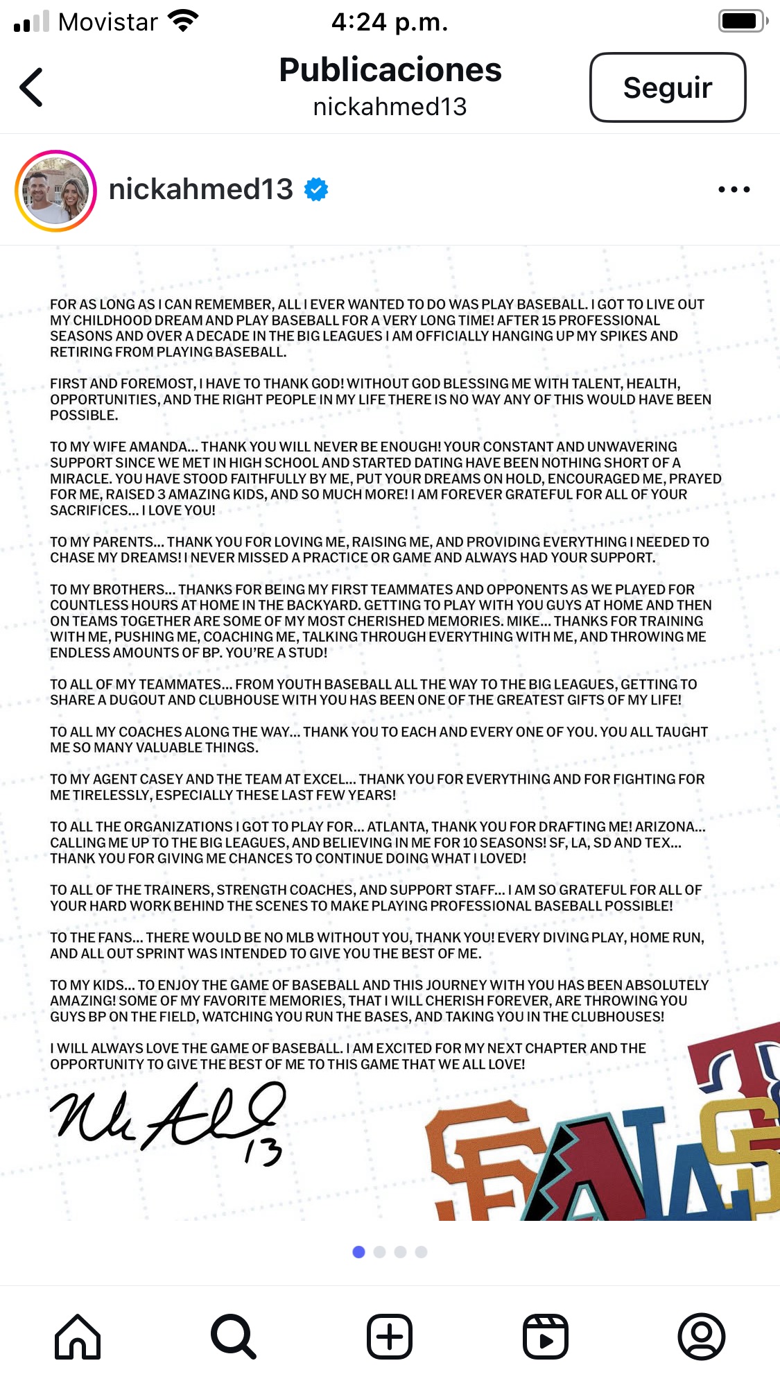 «¡Pude vivir mi sueño de la infancia y jugar por mucho tiempo!», escribió Ahmed. «Después de 15 temporadas profesionales y más de una década en las Grandes Ligas, oficialmente cuelgo los zapatos y me retiro del juego».
