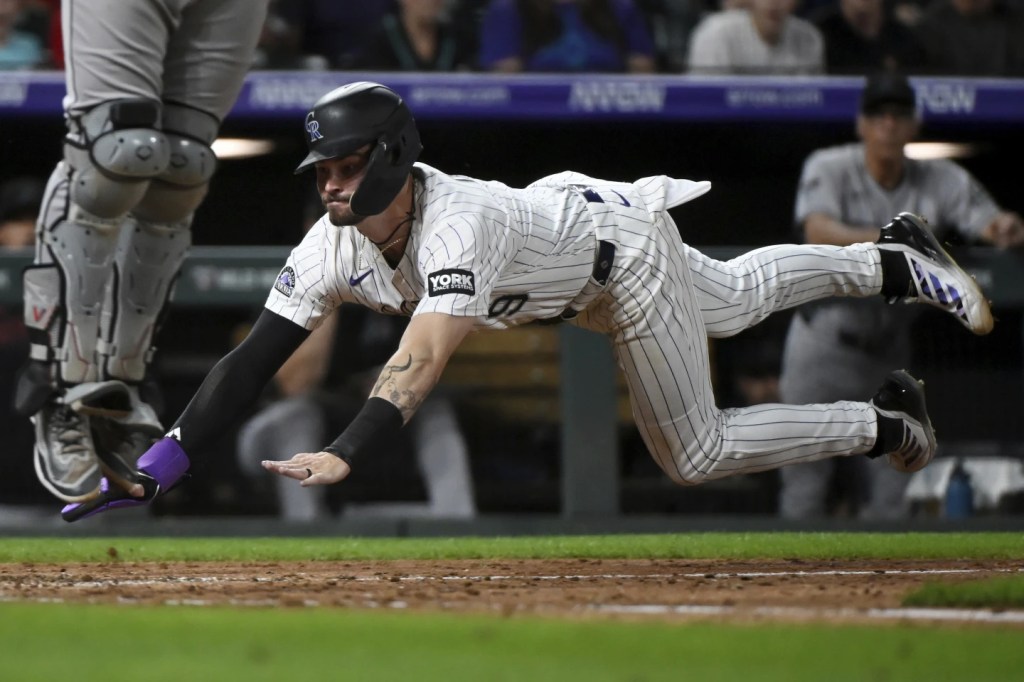 Brenton Doyle, de los Rockies, llega barrido de cabeza al plato