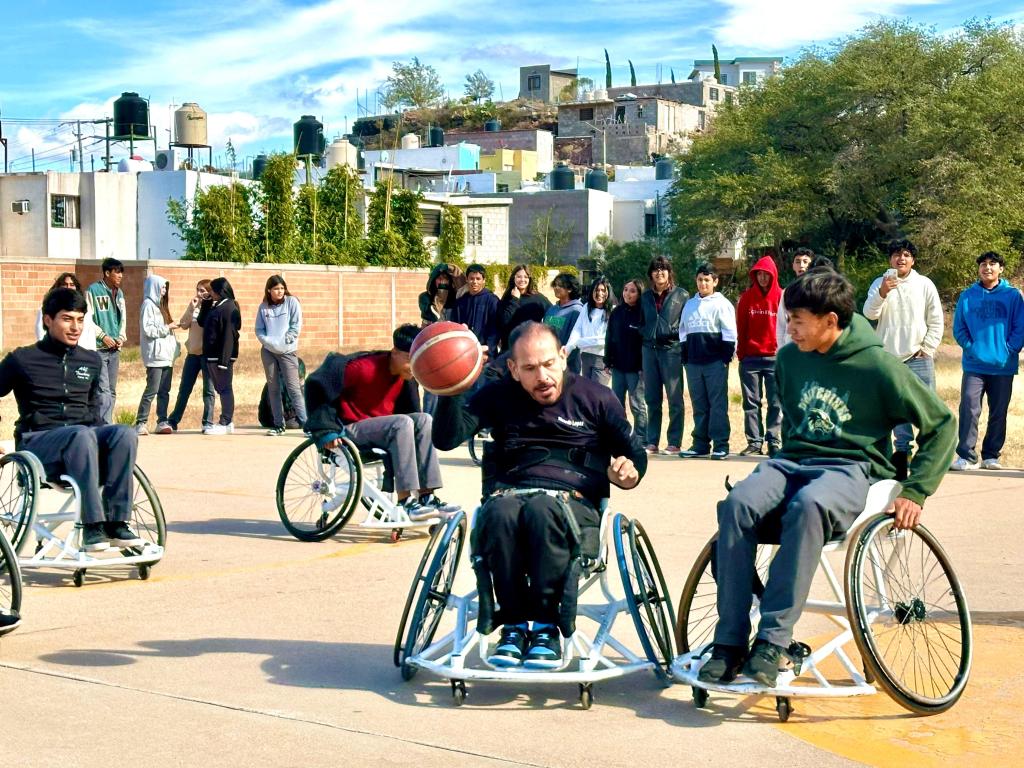 Al concluir la charla, el deportista encabezó carreras cortas y juegos de baloncesto en silla de ruedas, en los que participaron profesores y alumnos en la cancha de la institución