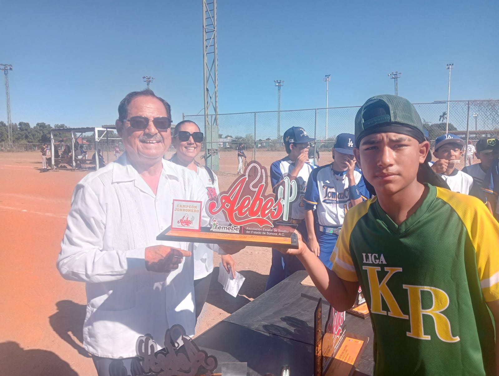 Cristóbal Vargas Rodríguez presidente de la Asociación Estatal de Beisbol del Estado de Sonora (Aebes), junto con Claudia Duarte delegada de las Infantiles de Aebes en Cajeme, entregaron los trofeos a lo más destacado del campeonato efectuado del 5 al 7 de diciembre en Obregón.