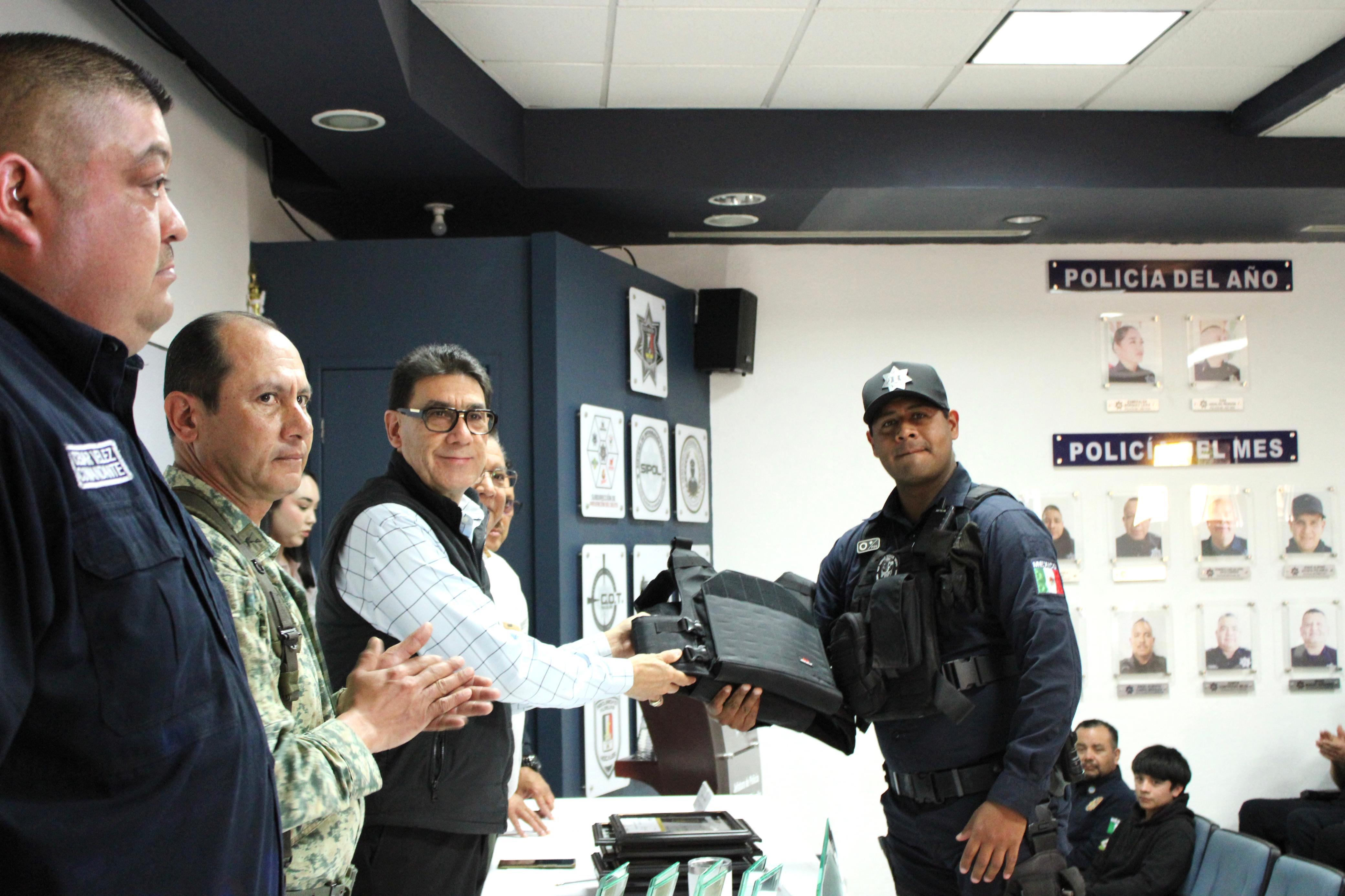 Ante la presencia del representante de la 45 Zona Militar, Luis Enrique Villa, del comisario de Seguridad Pública Municipal y de otros invitados, el presidente municipal Juan Gim entregó simbólicamente cinco equipos de seguridad a igual número de agentes de la corporación.