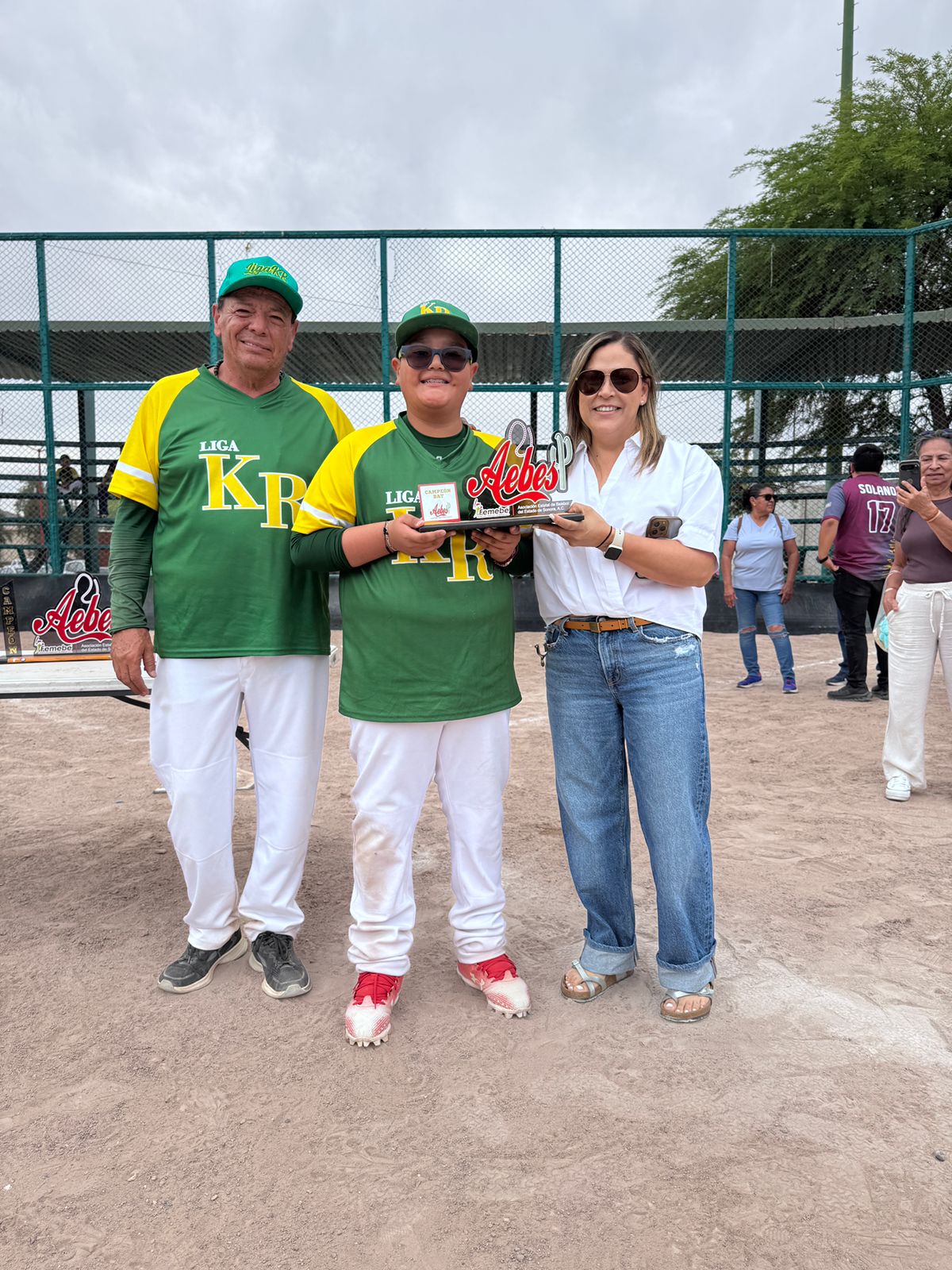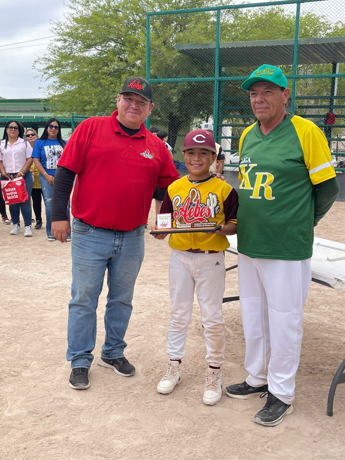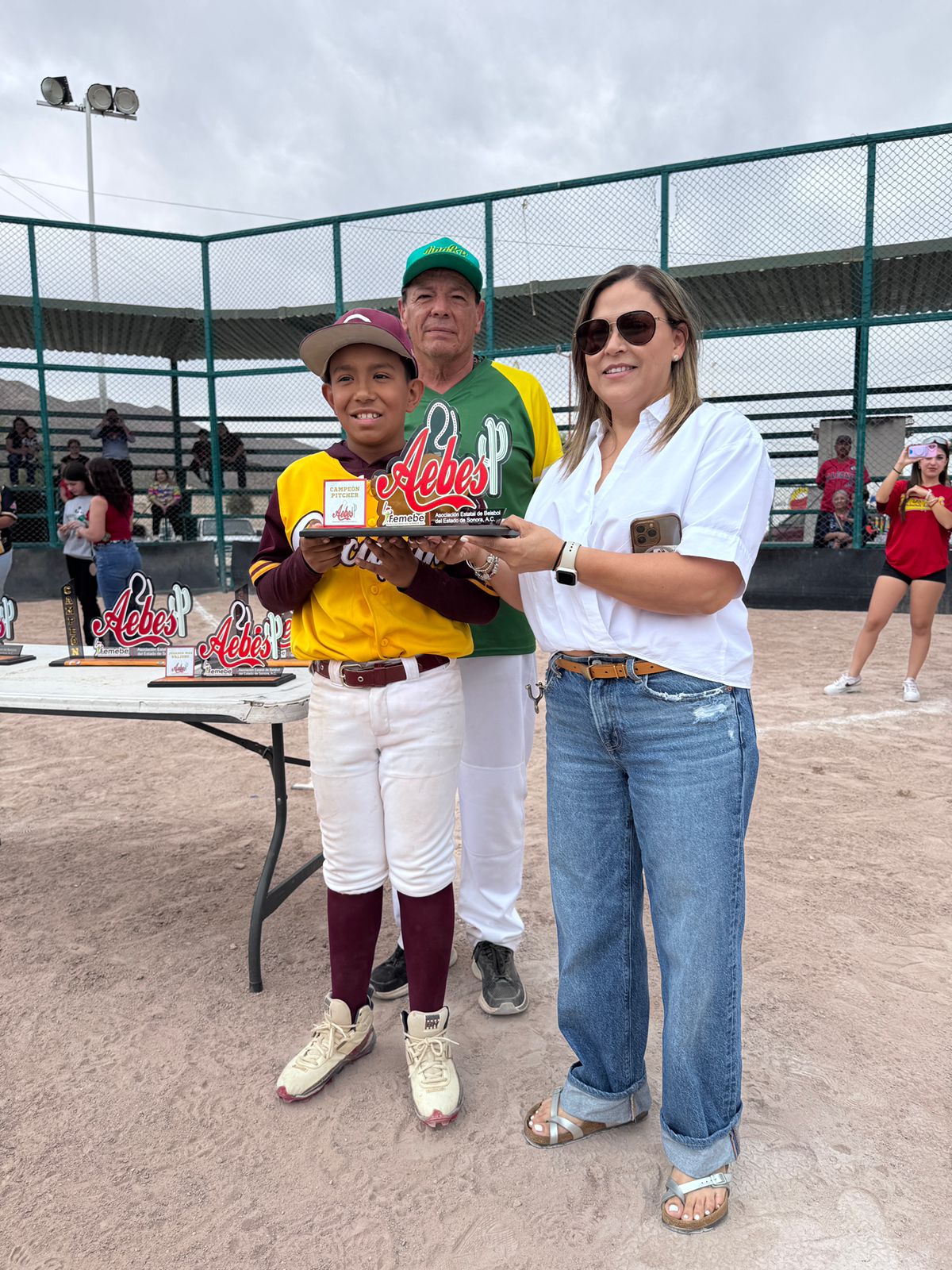 Entregaron los emblemáticos trofeos que Aebes otorga, César Díaz icepresidente de las categorías Infantiles y Juveniles de Aebes, Victor Ochoa presidente de la liga municipal de Magdalena y de la liga Anfitriona «Kaliman Robles» la señora Zoila Figueroa